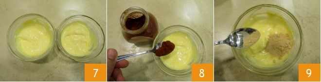 Divide la cantidad de mayonesa obtenida en dos cuencos 7 y aromatiza una con el pimentón 8 y la otra con el jengibre en polvo 9.