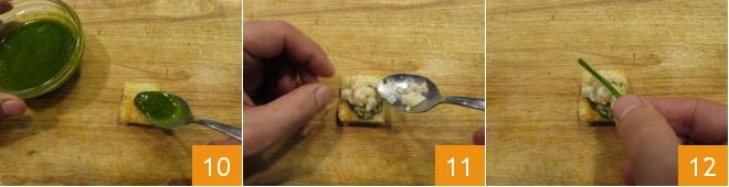 Para los 4 canapés con tartar de gambas: puedes decidir dividir aún más el pan brioche haciendo cuadraditos, luego esparce la superficie tostada con la reducción de albahaca 1, añade el tartar 2 y decora con un trocito de cebollino 3.