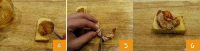 Para los 4 canapés con gambas y bacon: cubre la superficie del pan brioche con la mayonesa al pimentón 4, puedes dividir las gambas si prefieres 5 y colocarlas sobre el pan brioche 6.