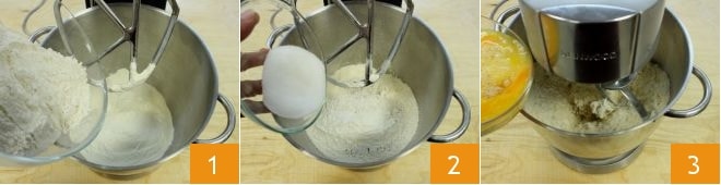 Para realizar el trío de canapés de pan brioche con gambas, comienza con el pan brioche: vierte las harinas tamizadas en el bol de una batidora con el accesorio de hoja 1, Añade la levadura deshidratada (también puedes usar levadura de cerveza fresca: en este caso la cantidad a usar es de 6 g), el azúcar 2 y los huevos poco a poco 3.
