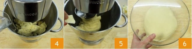 Añade también el agua a temperatura ambiente 4, entonces acciona la hoja a velocidad media. Cuando los ingredientes estén bien reunidos alrededor de la hoja, detén la batidora, sustituye la hoja por el gancho y acciona nuevamente la máquina; añade la sal y la mantequilla ablandada a temperatura ambiente en trozos poco a poco 5, esperando a que se absorba un trozo antes de añadir otro. Haz que la masa se amase con el gancho hasta que sea lisa y homogénea. Transfiere la masa sobre la mesa de trabajo y trabájala para darle una forma esférica. Colócala en un bol grande, cubre con film transparente 6 y deja reposar durante al menos 30 minutos en un horno apagado con la luz encendida.