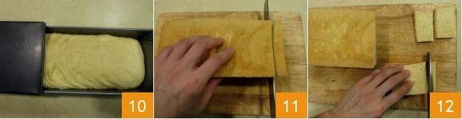 Pasado el tiempo necesario, cierra el molde con su tapa para obtener una forma más rectangular (de lo contrario déjalo descubierto y el pan brioche tendrá más impulso en el horneado, quedará más alto) 10. Hornea en un horno estático precalentado a 170° durante 30 minutos (si es un horno ventilado a 150° por 20 minutos). Una vez cocido, sácalo del horno y deja que se enfríe un poco, luego desmóldalo y deja que se enfríe completamente sobre una rejilla. Una vez frío, córtalo en rebanadas de 1,5 cm de grosor 11, corta una tira lateral para formar un rectángulo 12