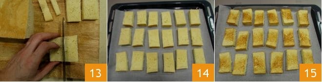 para luego dividir en dos 13: necesitarás 12 en total (con el pan brioche restante puedes preparar tostadas o crujientes crostini para servir con una sopa, por ejemplo!). Colócalos en una bandeja cubierta con papel de horno 14 y tuéstalos bajo el grill a 240° durante tres minutos (asegúrate de que los rectángulos de pan brioche se doren sin quemarse, puedes voltearlos a mitad de cocción) 15. Una vez listos, sácalos del horno y deja que se enfríen.