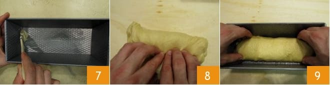 Unta un molde rectangular de 26x11,5 cm con mantequilla 7. Luego retoma la masa y manéjala brevemente, realizando unos pliegues 8 y forma un rollo del mismo tamaño que el molde. Coloca el pan brioche en el molde 9 y déjalo reposar otros 30 minutos cubierto con film (puedes alternativamente untarlo con huevo batido con una cucharada de leche).