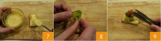 Para los 4 canapés con calabacín y gambas: cubre el pan brioche con mayonesa de jengibre 4, crea una rosa de calabacín, enrollando la rodaja en vertical 5 y coloca encima la gamba caramelizada 6. O envuelve simplemente la cola de gamba con la rodaja de calabacín.