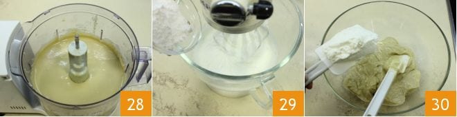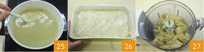 y dejad que se derrita la mezcla hasta llevarla a ebullición durante 2 minutos 25. Apagad el fuego y verted la crema en un recipiente ancho y bajo. Cubrid con film y meted en la nevera para enfriar y espesar durante aproximadamente 3-4 horas 26. Cuando la crema esté fría y compacta, pasadla al mixer 27.