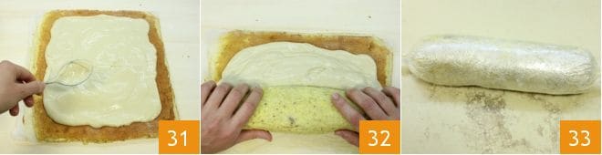 Cuando el bizcocho esté frío, retirad el film y rellenadlo con la crema de café extendiéndola por toda la superficie con una cuchara o con un cuchillo largo de hoja lisa dejando un margen de unos 2 cm para evitar que se salga cuando vayáis a enrollarlo 31. En este punto, una vez finalizado el relleno, enrollad delicadamente el bizcocho 32 y envolvedlo con film y mantenedlo en la nevera para compactarlo 33.