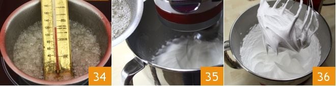 Por último, preparad el merengue italiano. En un cazo verted el azúcar y el agua, calentad a fuego bajo hasta que se disuelva el azúcar, cuando se haya formado el jarabe y comience a hervir, sumergid el termómetro hasta alcanzar 120° C 34. Mientras tanto, montad las claras a punto de nieve con unas gotas de zumo de limón y cuando el jarabe haya alcanzado la temperatura indicada vertedlo en hilo sobre las claras continuando montando con la varilla 35. Cuando el merengue esté denso y suave 36
