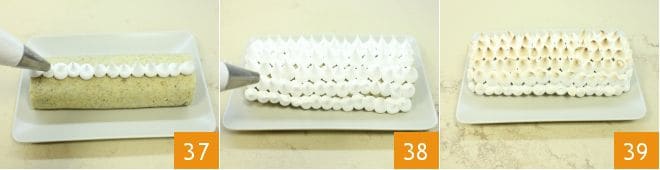 transferidlo a una manga pastelera con boquilla estrellada y decorad la superficie del tronco con copos de merengue (37-38). Hornead el tronco en el horno durante 5 minutos bajo el grill bien caliente para dorar el merengue. ¡Vuestro tronco de café con merengue flameado está listo para ser degustado 39!