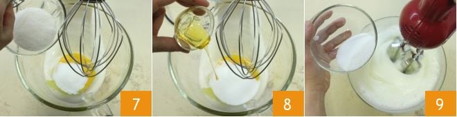 Ahora preparad el bizcocho: en un robot de cocina equipado con varilla poned las yemas, 90 g de azúcar granulada 7 y la miel 8, activad la máquina hasta obtener una mezcla clara. Aparte montad las claras a punto de nieve con el azúcar restante 9
