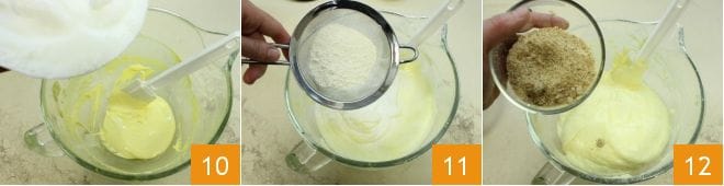 hasta obtener una mezcla clara y espumosa (si no disponéis de un robot de cocina usad unas varillas eléctricas). Incorporad las claras montadas a la mezcla 10. Luego verted la harina 00 11 y la harina de avellanas 12