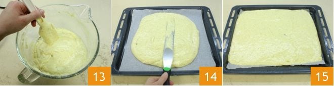 Incorporad los ingredientes con una espátula 13. Extendéis la masa sobre una hoja de papel de horno, colocada sobre una bandeja de horno de dimensiones de 45 x 37 cm, y niveladla con una espátula plana y lisa hasta alcanzar un grosor de 1 cm (14-15). Hornead en horno estático ya caliente a 220° durante 6-7 minutos (no más); la superficie del dulce debe quedar apenas dorada y no debéis abrir el horno que retendrá en su interior la humedad.