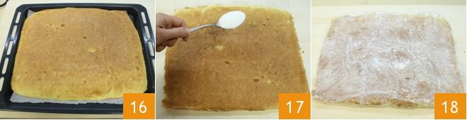 Extraed el bizcocho del horno 16, retiradlo inmediatamente de la bandeja, colocándolo con todo el papel de horno sobre una superficie. Espolvoread la superficie del bizcocho con azúcar granulado 17, para que no se pegue, y selladlo inmediatamente con film, doblándolo también debajo de los lados 18. De este modo el bizcocho, al enfriarse, retendrá en su interior toda la humedad que servirá para que sea elástico y ayudará a doblarlo sin que se rompa.