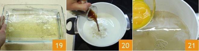 Ahora encargáos de la crema. Tomad un bol, llenadlo de agua fría y poned a remojo la gelatina 19. Luego tomad una cacerola y verted la leche, el café de la moka 20, las yemas 21 y