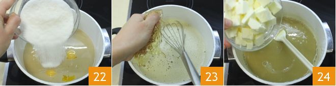 el azúcar 22 y llevad casi a ebullición. Añadid la gelatina escurrida 23, la mantequilla en cubos 24