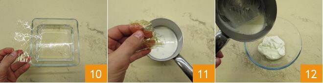 Mientras tanto, ocupáos de la crema. Dejad fuera de la nevera el yogur durante unos diez minutos. Ponéd la gelatina a remojar en agua fresca 10. Mientras tanto, calentad los 20 g de nata en un cazo, teniendo cuidado de que no empiece a hervir. Cuando esté a temperatura, escurrid la gelatina y mezclad inmediatamente para que se disuelva 11. Verted la mezcla recién obtenida en el bol con el yogur 12