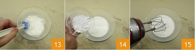 mezclad cuidadosamente 13. Pasad a la nata, vertedla en un recipiente amplio, añadid el azúcar glas 14 y montad con las varillas: empezad a baja velocidad y aumentad progresivamente mientras se infla. Obtened una mezcla montada pero no demasiado 15.