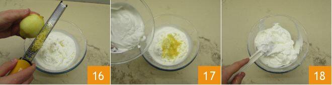 rallad la piel de limón 16 e incorporad junto con la mezcla de yogur 17 con mucha delicadeza, con movimientos de abajo hacia arriba 18.