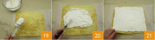 Igualad la masa de bizcocho recortando los bordes y verted ¾ de la crema 19 teniendo cuidado de dejar un centímetro descubierto desde los bordes 20. Comenzad a enrollar ayudándoos con el papel de horno 21.