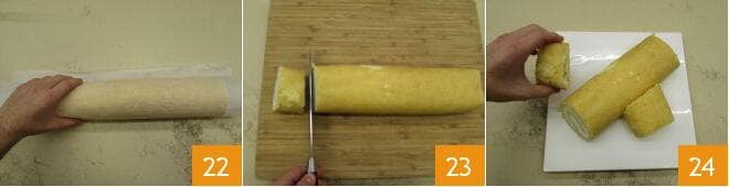Sellad bien y colocad en el frigorífico a enfriar durante al menos un par de horas junto con el bol con la crema restante 22. Pasado el tiempo, quitad el papel de horno y cortad dos piezas en diagonal, una un poco más larga que la otra 23. Colocad la parte central del tronco en el plato de servir y los dos extremos de manera desfasada, de modo que represente de manera realista un tronco 24