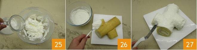Recuperad la crema, diluidla con muy poca nata, justo la necesaria para suavizarla un poco 25 y glasead el tronco 26 teniendo cuidado de no cubrir la parte que parece el interior del tronco 27.
