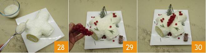 Espolvorad la superficie con el coco rallado 28 y colocad en la nevera otra media hora. Finalmente adornad con bayas de grosella y algunas agujas de romero 29. Aquí está listo vuestro tronco de Navidad nevado: ¡felicidades 30!
