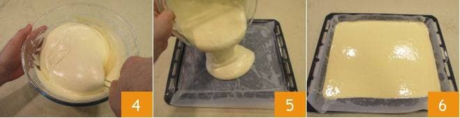 mezclad con una espátula de abajo hacia arriba para incorporar sin desmontar 4. Entonces verted la mezcla en una bandeja para hornear de 30x38 cm ya engrasada y forrada con papel de horno 5. Nivelad cuidadosamente y pasad a la cocción 6: