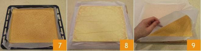 la masa de bizcocho se cuece en el horno ya caliente a 220°, durante unos 8-9 minutos 7. Cuando esté lista, dadle la vuelta sobre una hoja de papel de horno y dejadla enfriar 8, después será suficiente despegar el papel con extrema delicadeza 9.