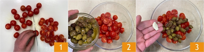 Para preparar la trucha asalmonada a la sartén, comienza con los tomatitos: córtalos por la mitad 1 y colócalos en un bol junto con las aceitunas taggiasche 2. Adereza con sal, aceite y un diente de ajo 3, mezcla y reserva momentáneamente.