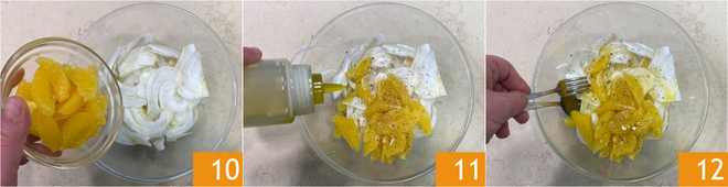 Une hinojos y naranjas en un bol 10, luego adereza con sal, pimienta y aceite 11. Mezcla delicadamente 12.