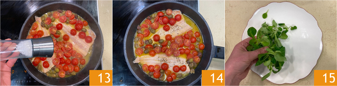 En este punto, la trucha estará cocida, así que ajusta de sal 13 y pimienta. Apaga el fuego y deja reposar por un minuto antes de emplatar 14. Distribuye el canónigo en la base del plato 15.