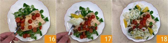 Coloca encima un filete de trucha con su salsita de tomatitos y aceitunas 16, luego añade al lado la ensalada de naranjas y hinojos 17. Finalmente, adorna con perejil picado. ¡Tu trucha asalmonada a la sartén está lista para ser servida 18!