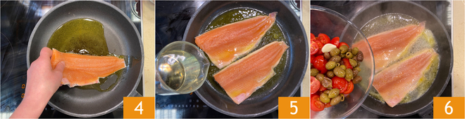 Calienta un poco de aceite en una sartén antiadherente grande y coloca los filetes de trucha del lado de la piel 4. Cocina a fuego medio durante 2-3 minutos, luego sube un poco la llama y rocía con vino blanco 5. Cuando el alcohol se haya evaporado completamente, agrega la mezcla de tomatitos y aceitunas 6.