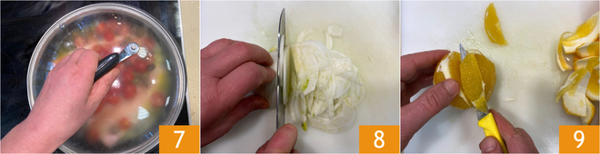 Cubre con la tapa 7 y continúa la cocción durante otros 5-7 minutos, sin dar la vuelta a los filetes. Mientras tanto, prepara la ensalada de hinojo y naranjas: corta finamente los hinojos 8, luego pela las naranjas y pélalas al vivo, es decir, saca los gajos metiendo un cuchillo afilado entre la pulpa y la membrana blanca que los separa 9.