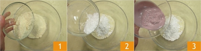 Para realizar las trufas de yogur, vierte la harina de almendras en un bol 1, luego añade el azúcar glas 2 y el yogur de frutas del bosque 3.
