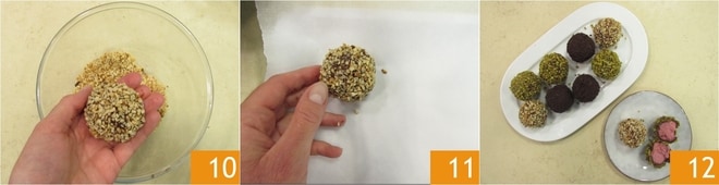 Después de haberla cubierto por completo 10, colócala sobre un papel de horno 11 y procede de esta manera con todas las demás trufas, alternando la cobertura de avellanas con la de pistachos y con las virutas. ¡Tus trufas de yogur están listas para ser servidas 12!