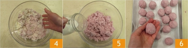 Mezcla los ingredientes con una cuchara o con las manos 4, luego añade también la nata 5 y amasa todo hasta obtener una mezcla homogénea. Forma bolitas de un peso de aproximadamente 25 g cada una 6; con estas cantidades obtendrás alrededor de 24 piezas.