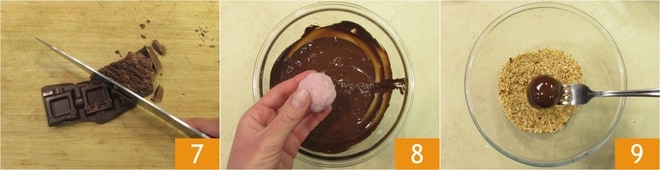 Ahora tritura el chocolate negro 7 y fúndelo al baño maría o en el microondas. Vierte los frutos secos triturados y las virutas en boles diferentes. Sumerge una bolita a la vez en el chocolate fundido 8, luego pásala por los frutos secos 9.