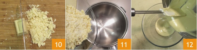 Ahora pica el chocolate blanco 10 y derrítelo al baño maría 11, luego viértelo en un bol 12.