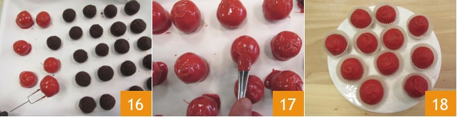 Escurre las bolas con la herramienta adecuada o con la ayuda de un tenedor y colócalas nuevamente en la bandeja con papel de horno 16. Utiliza el extremo del mango de una cucharilla para hacer decoraciones con el chocolate rojo 17, luego vuelve a ponerlas en el frigorífico durante 1-2 horas. ¡Una vez secas, sirve tus trufas rojas en moldes de papel 18!