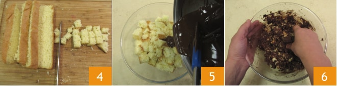 Mientras tanto, corta el bizcocho en cubos 4 y transfiérelos a un bol. Vierte el chocolate derretido en el bol con el bizcocho 5 y comienza a mezclar con una espátula, luego amasa con las manos 6.