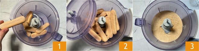 Para preparar las trufas tiramisú, como primer paso prepara el café y deja que se enfríe hasta que esté a temperatura ambiente. Coloca los bizcochos en el recipiente de una batidora con cuchillas 1, cierra la tapa 2 y tritúralos hasta reducirlos a polvo 3.
