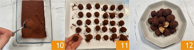 Pásala por el cacao, cubriéndola bien por todos los lados 10 y continúa de esta manera hasta terminar la mezcla; con estas cantidades obtendrás alrededor de 30 trufitas. Colócalas poco a poco en una bandeja 11 y ponlas en el frigorífico al menos una hora (o en el congelador durante 20 minutos) antes de servirlas. ¡Tus trufas tiramisú están listas para ser degustadas 12!
