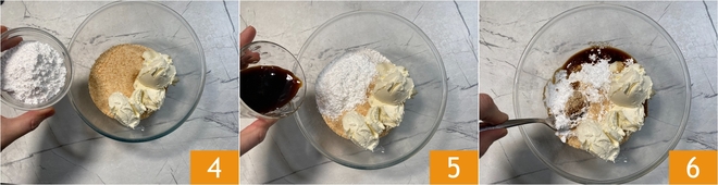 Transfiere el polvo de galletas a un bol, luego añade el mascarpone, el azúcar glas 4 y el café 5. Mezcla con una cuchara 6.