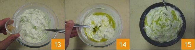 Finalmente añade la crema de ajo 13 y mezcla de nuevo 14. Deja reposar tu salsa tzatziki en el frigorífico durante 2-3 horas para permitir que los sabores se amalgamen de la mejor manera 15!