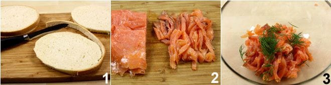 Para preparar los huevos en cocotte con salmón ahumado, comienza quitando la corteza de las rebanadas de pan con un cuchillo, 1 úntalas ligeramente con aceite de oliva virgen extra y ponlas a tostar en el horno, en modo grill, durante unos minutos, girándolas durante la cocción. Mientras tanto, corta el salmón ahumado en tiras finas 2 y colócalo en un bol, añade las ramitas de eneldo 3