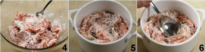 la ricotta y mezcla bien los ingredientes 4. Unta con mantequilla 4 cocottes de horno, coloca en ellas la mezcla de salmón y ricotta 5 y haz un pequeño hueco en el centro de cada cocotte con el dorso de una cucharilla 6.