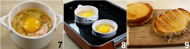 Coloca un huevo (teniendo cuidado de no romperlo) encima de cada cocotte 7. En este punto, llena una bandeja de horno con agua hirviendo hasta la mitad, pon dentro las cocottes 8 y hornéalas a 180°C durante 15 minutos. Decora con pimienta molida, hojas de eneldo y sirve los huevos en cocotte con salmón acompañándolos con las rebanadas de pan tostado cortadas en tiras 9.