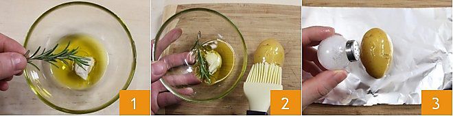 Para preparar el vacherin al horno con hierbas, comienza poniendo en un bol una cucharada de aceite, el diente de ajo y la mitad del romero 1 que servirán para aromatizar las patatas que acompañarán el vacherin. Con un pincel de cocina unta las patatas con el aceite aromatizado 2, sala 3 y