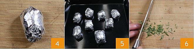 envuelve las patatas en un papillote con papel de aluminio 4. Cocina las patatas al papillote en horno estático precalentado a 200° 5 durante unos 50 minutos (o en horno ventilado a 180° durante 40 minutos). Pica el romero restante 6 y resérvalo.
